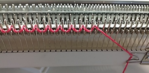 Jede zweite Nadel in Arbeitsstellung bringen. Maschenweite zwei Nummern kleiner als die Hauptweite einstellen. Eine Reihe stricken.